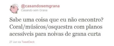 Então eu havia jogado a toalha e não recomendava mais pra ninguém. Foi quando uma leitora me enviou um email pedindo uma recomendação visto que também era um grande sonho para ela e ela iria se casar em uma igreja lindona e tals… Fui ajudar a gatona e continuei a dar com os burros n’água. Apelei então pro Twitter: