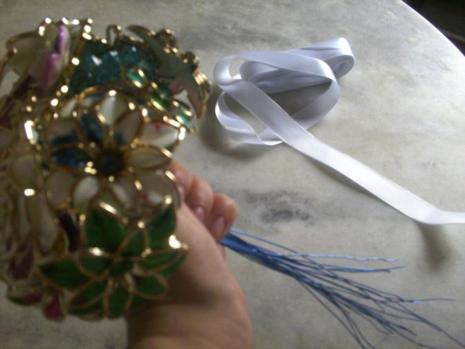 Passo 6) Por último, com o bouquet já formado, é só enrolar a fita de cetim ao longo do cabo e arrematar com laço ou costura simples. Só lembre de firmar bem antes as peças juntas, pois o peso dos broches tende a abrir o bouquet se você não unir bem todas as peças.