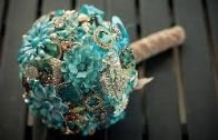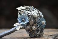 Passo 5) Feito isso, junte os broches conforme o seu gosto, da mesma forma que faria com flores naturais. Monte tudo aos poucos com muita delicadeza e nada de pressa. Enrole mais fita musgosa ao redor de todo o ‘caule’ do bouquet para firmar.