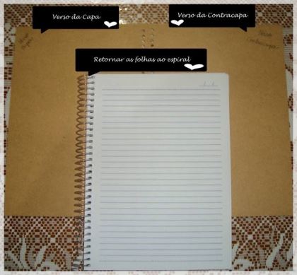 1) Retirar a capa e contracapa do espiral: para não errar na decoração, identifique as faces e para não ter dificuldades posteriores, retorne as folhas pautadas para o espiral, assim a perfuração não se perde!