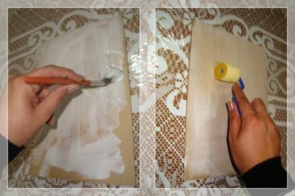 2) Espalhar cola branca: espalhe a cola branca com um pincel em uma face por vez. Depois utilize um rolinho de espuma, para uniformizar a cola.