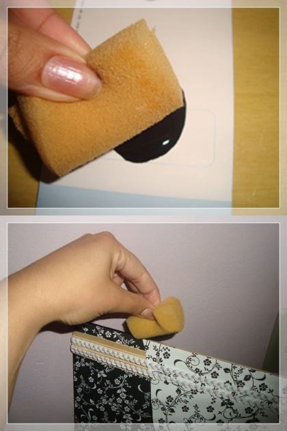 6) Pintura lateral: Para finalizar o trabalho é necessário utilizar uma pequena esponja para aplicar em toda a borda do caderno a tinta PVA.