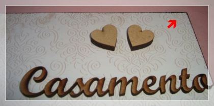 Capa: Para decorar a capa utilizei a palavra “Casamento” em MDF e 2 corações também em MDF (optei por deixar mais natural, rústico e por isso não pintei as peças, mas elas podem ser pintadas conforme a preferência).
