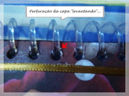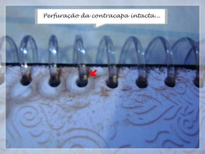 5) Refazer a perfuração do espiral: após retirar as sobras de papel da capa e contracapa, e, antes de iniciar a colagem de papel no verso das mesmas, é necessário refazer a perfuração para o espiral.