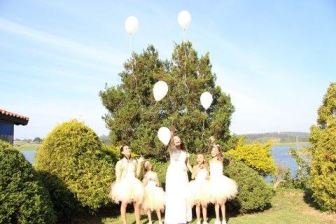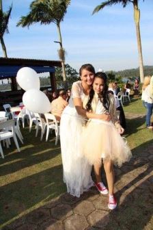 As roupas das daminhas: eu pedi off-white, mostrei o tecido e costureira montou na cor palha, ficou escura demais, então ela colocou tule branco de fundo e ficou bom, o problema maior foi que a costureira faltou conosco nas duas últimas provas e um dos vestidos não fechou, faltou mais de 13cm pra fechar, que medidas ela tirou? Acabou que uma daminha não entrou, ela ficou triste e eu com raiva, minha irmã que foi devolver, não quis nem olhar.
