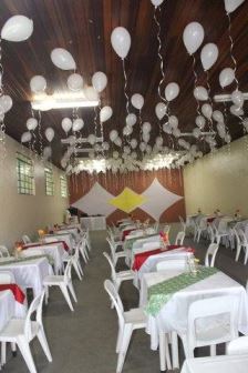 Decoração II: contratei uma empresa para colocar balões com gás hélio no dia da festa, foi a sensação, o que tinha de criança pegando no salão e jogando no céu… Até a noiva jogou hehehe.