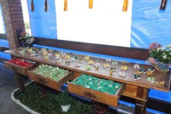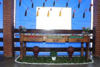A Decoração: com a idéia deste blog juntei garrafinhas de vários tamanhos com as tias, minha sogra, todo mundo eu pedia garrafinha, minha amiga me mandava toda segunda uma leva de garrafa long neck, decorei todas com a ráfia menos as long necks, na 25 de março comprei tecidos de chita e tergal para fazer toalhas, (depois da festa dei pra minha mãe se divertir em sua máquina de costura, ela amou), o mesmo tecido foi para embalar os bem-casados.