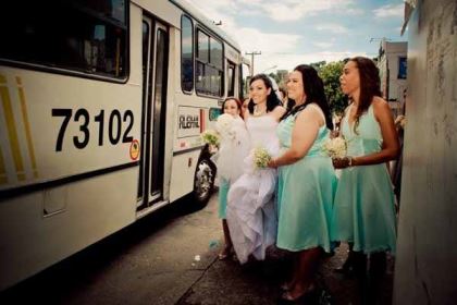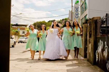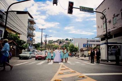 Como eu casei na igreja de um lado do Largo do Bicão e a minha casa de festa seria do outro lado do Largo eu resolvi ir andando da igreja pro salão. Foi uma experiência maravilhosa, pois vi como as pessoas ainda olham com olhar de carinho pra uma noiva. Ainda mais pra uma louca andando na rua e atravessando ruas! rs Muitos carros buzinando e gente me dando tchau! Foi emocionante!