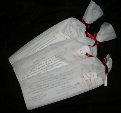 – Meus convites eu que fiz. Aliás quis inovar, por que não é por você querer economizar que tem que ser de qualquer jeito. Tem que fazer com amor e um toque de personalidade. Usei tecido para envolver o convite como se fosse um saquinho amarrado e serviu também para os convidados levarem doces para casa. Amei!!