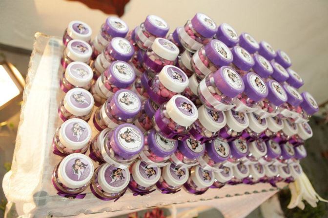 As lembrancinhas dos convidados foram na base do faça você mesma, um amigo nosso fez os adesivos e o restante tudo comprado na 25 e os confetes em forma de coração em uma doceria especializada, é claro que acabou em 5 minutos porque quando as crianças descobriram que era comestível fizeram a festa, rsrsrsrs, para os padrinhos foram chinelos personalizados que ficaram super legais.