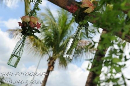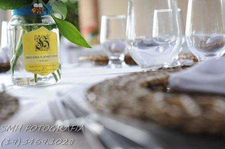 Pensamos primeiro em comprar as flores e decorar nós mesmo, mas minha sogra e sogro nos deram de presente a decoração. Mas não abri mão dos meus vidrinhos e levei para e floricultura usar. Com isso de R$25 caiu para R$9 cada arranjo da mesa.