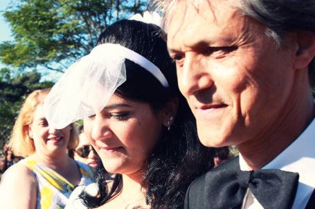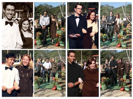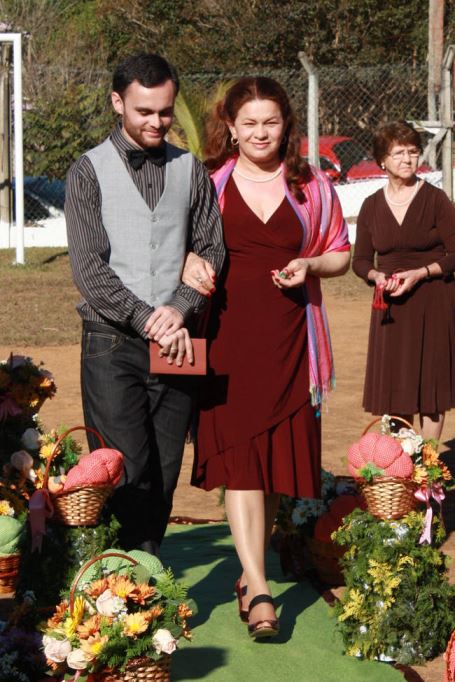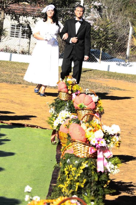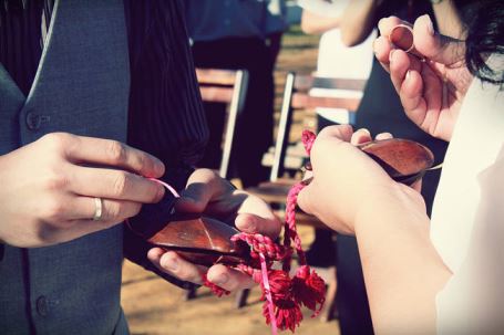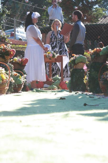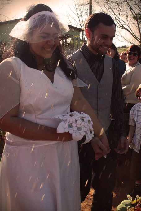 Resolvemos fazer tudo na chácara dos meus pais. Eu estava louca porque não conseguia decidir quem celebraria a cerimônia já que juízes e padres da católica brasileira me passaram orçamentos que eu não tinha como pagar. Eu sei que é o preço, mas não tinha mesmo! Sonhei que uma prima minha, Rosane, celebrava a cerimônia, então pedi a ela, mas quase não deu certo porque o pastor da igreja que ela frequenta disse que ela não tinha formação pra isso. Mas eu a convenci! Afinal não estávamos nos casando em nenhuma religião e em nenhum templo pra ter regras de “pode ou não pode”.