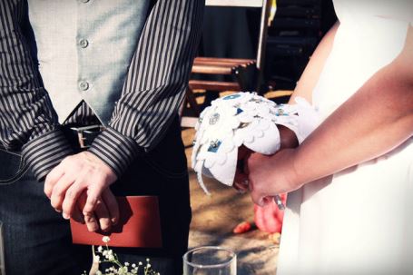Não tenho religião, apesar de Cristã e meu marido é agnóstico (ele acredita em uma força maior, mas que é algo que nunca tomaremos conhecimento). Dessa forma não envolvemos religião alguma, e o noivo concordou em citarmos a Bíblia. A partir daí minha mãe decidiu escrever a cerimônia.