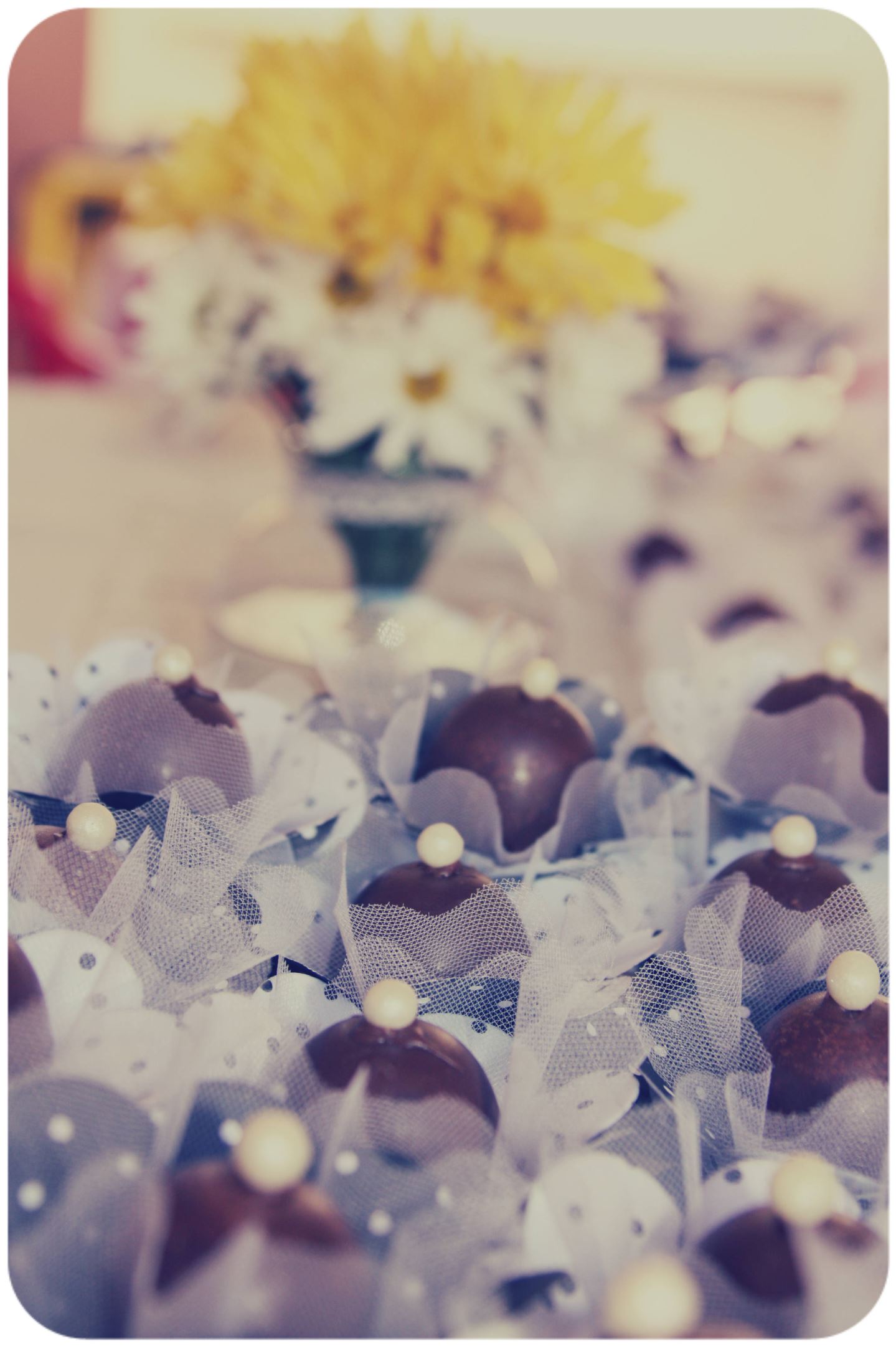 Minha sogra, que faz bombons, fez mini bombons e muffins para as lembrancinhas, os quais decorei com pérolas comestíveis (chocoball branco com pó perolado).