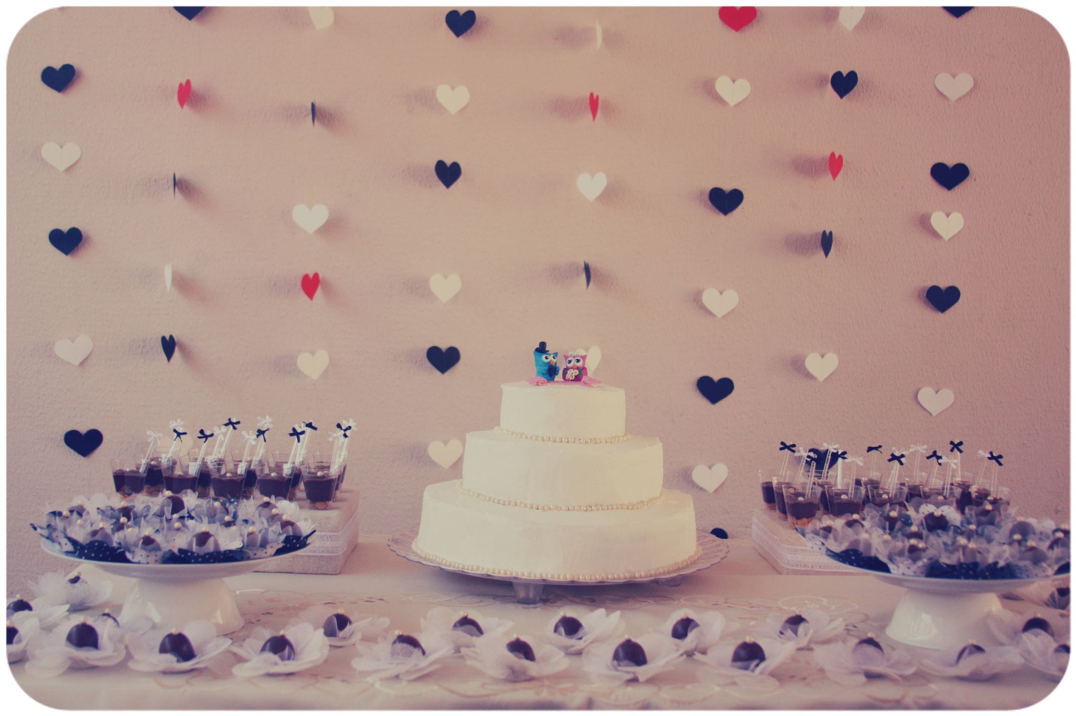 Passamos uma noite inteira recortando corações para decorar a parede do bolo. Eu fiz a almofada para alianças e os suportes para docinhos.