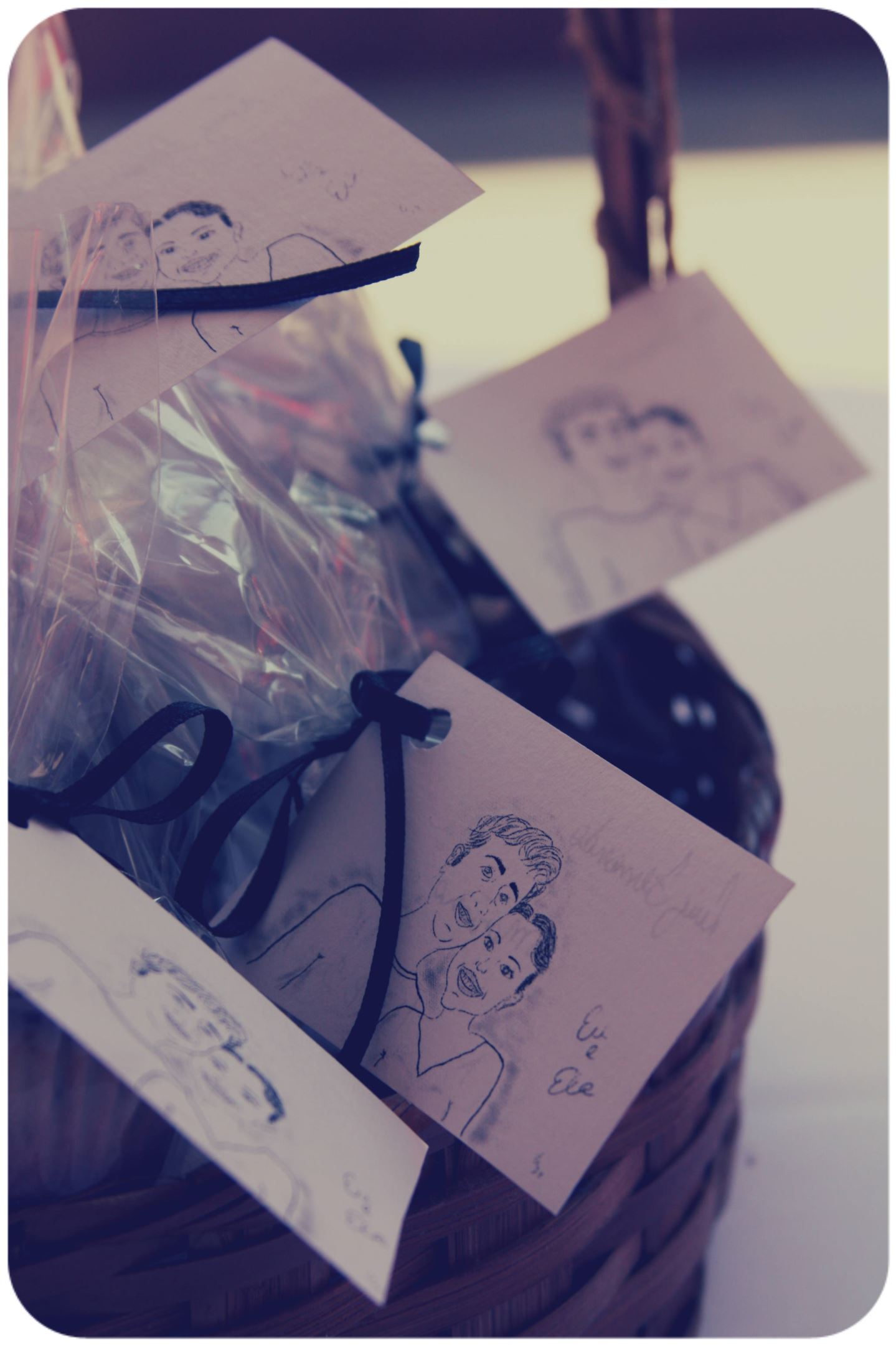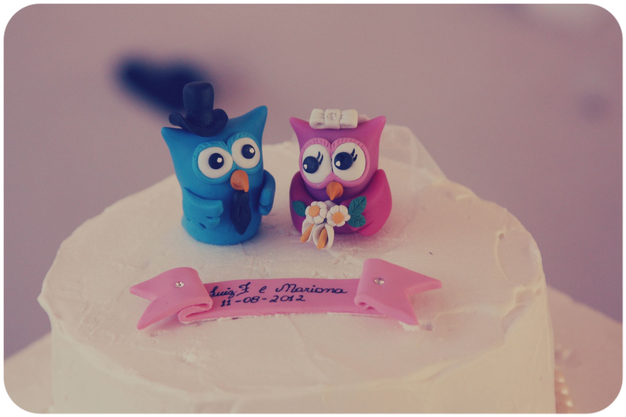 O Luiz Fernando fez os noivinhos do bolo em formato de coruja e desenhou nossas caricaturas nas tags das lembrancinhas.