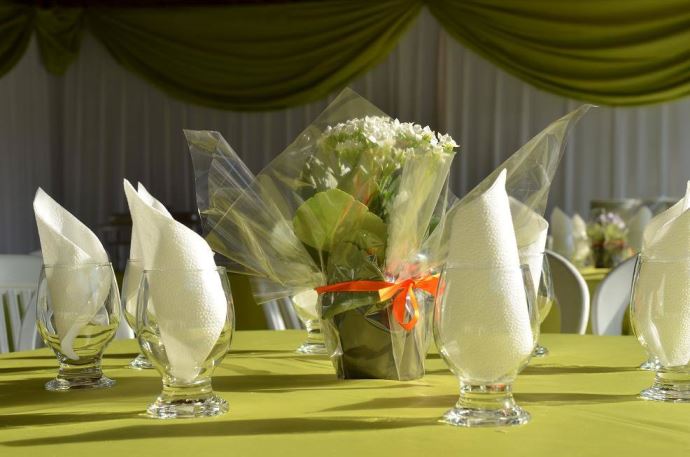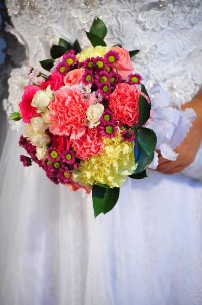 O buquê e a decoração foram feitos por uma amiga. Nas mesas foram usados vasinhos de kalanchoe e no cortejo crisântemos coloridos em cestos de palha.