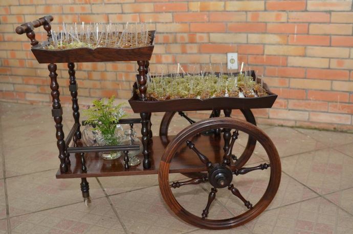 Os bombons da mesa do bolo e os copinhos com doce de mamão ralado do carrinho de madeira ganhei de presente de amigos.