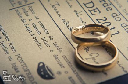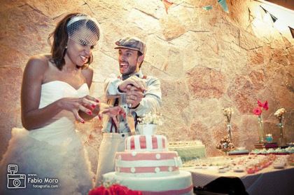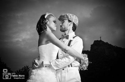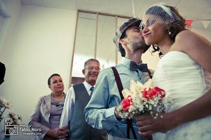 ” Sobre nossa história, também não sei o que dizer… Nos conhecemos pela internet, coisa de blog. Eu no Rio e ele lá em Londrina, no Paraná. Um dia, depois de quase 2 anos de conversa, acordei um belo dia e falei: tenho que conhecer esse cara! Sabe quando a Kiddo acorda do coma em Kill Bill? Foi exatamente assim, eu estava cochilando a tarde e então aquilo me ocorreu como um susto, uma revelação. A coisa toda foi muito enrolada com momentos de extrema alegria e de extrema tristeza, principalmente momentos de total falta de grana (chegamos a procurar emprego de caixa das Lojas Americanas, como dobradores de roupa..). Fomos morar juntos e assim estávamos até essa decisão ensandecida de casarmos. Lá no blog fiz um post que explica melhor tudo o que nos aconteceu como nunca vou conseguir, aqui ó.