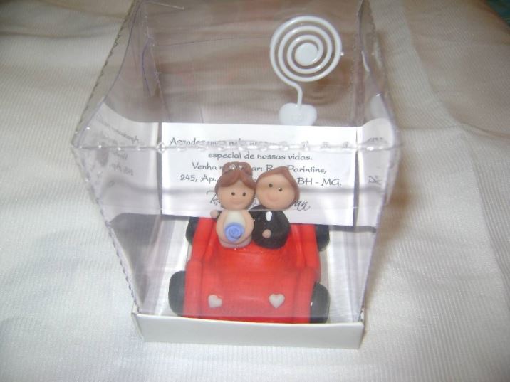– Como amante da Galeria do Ouvidor, lá comprei o material para fazer o buquê de pirulitos da minha dama e as boutonnieres de pirulito para os pajens (uma delas foi esquecida, rsrs), comprei tubos de ensaio e enchi de balas para as crianças e também encomendei as lembranças dos pais e padrinhos, que foi um porta-foto de biscuit, em formato de um fusca vermelho com os noivinhos dentro (nós temos um fusca vermelho, por isso o motivo!).