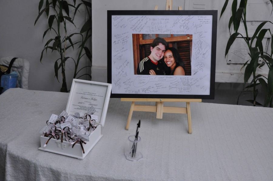 Quadro de assinaturas: comprei uma moldura sem imagem colei uma foto, comprei um cavalete pequeno na Kalunga e pronto!