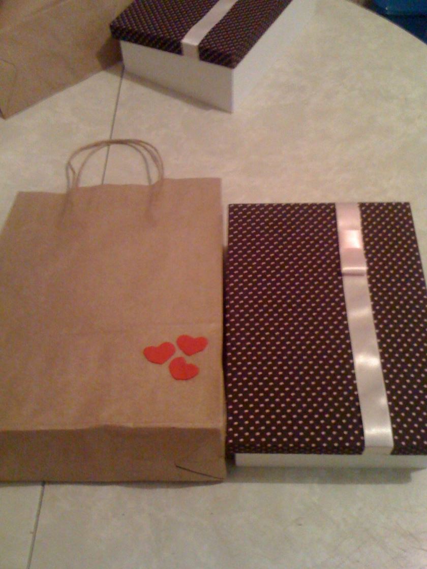 Já as lembrancinhas dos padrinhos, fiz uma caixa de mdf enfeitada com tecido e uma garrafa de mini vinhos que compramos no atacado. Ainda comprei uma sacola craft e enfeite com corações de feltro.
