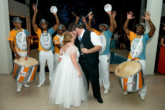 Consegui a escola de samba em uma rodada de descontos. Eles foram perfeitos, a festa não teria sido o que foi sem eles. O DJ e a iluminação ganhei do meu irmão. Um ótimo profissional, valor justo. Foi o DJ Orlando Gonçalves. O buffet, Brasil Eventos, do Chef André Santos não foi dos mais baratos, 52 por pessoa, mas foi perfeito, perfeito! Agradava a todos!
