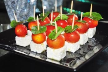 • Espetinho de tomate cereja com tofu ou queijo e manjericão