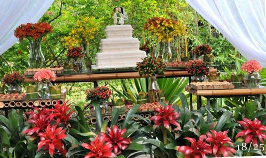Para começar, podemos falar dos arranjos com plantas! Afinal, plantas não são flores… e sim, fica perfeito para montar a decoração um dia antes e também, basta pesquisar e verificar quais resistem melhor ao calor. Como exemplo, temos as lindas bromélias. Aqui em SP pesquisei e o preço de 6 vasos varia entre R$ 40 e 90. Por esse preço, vale investir como uma boa ideia para enfeitar a mesa do bolo. Quem tiver acesso, a aldeia guarani em Boracéia (litoral norte de SP) é habilitado pelo Ibama para vender as bromélias, olha que interessante: fazemos uma decoração inovadora e sustentável – ajudando os indígenas em seu trabalho e subsistência.