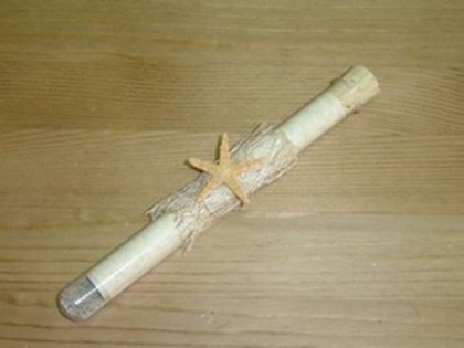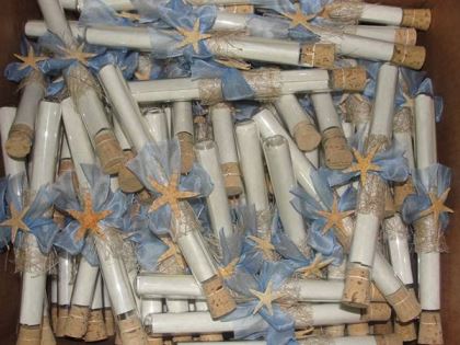 A seguir, tubos de vidro com rolhas, decoradas no tema “praia”. Magníficos!