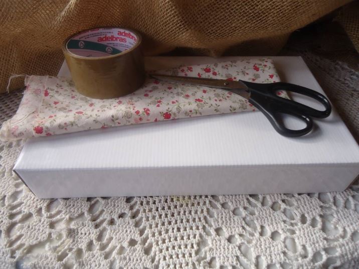 Recorte o tecido lembrando-se de deixar sobras para as laterais e para o acabamento. Do jeito que você faz ao embrulhar um presente. E depois cole o tecido com fita colante.