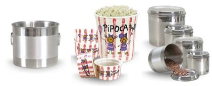 Baldes para gelo, pipoca, porta mantimentos e diversos outros itens, decorados ou não, em alumínio.
