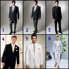 Deu pra sacar? Fraque é comprido atrás (foto 1, tipo do Pinguim, vilão do Batman), meio fraque tem comprimento menor (foto 2, mais próximo dos blazers comuns), casaca (foto 3, tipo casaco), terno comum (foto 4)e o summer (fotos 5 e 6 – noivas normalmente não curtem dividir a cor branca com ninguém nesse dia). Mais do que explicar as diferenças, vou tentar chamar a atenção para alguns detalhes do traje do noivo.