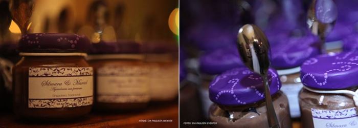 Detalhe: A colher de plástico imita inox, o que dá um ar ainda mais sofisticado à essa ideia saborosa do potinho de brigadeiro. Além disso, a tampa foi revestida e pintada à mão, de acordo com a decoração do casamento. E, para personalisar, o rótulo com o nome dos noivos e um agradecimento curtinho, mas superdelicado. Genial, não?