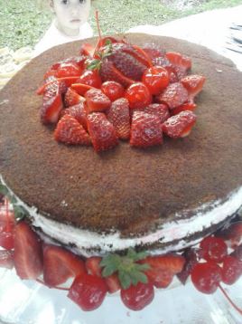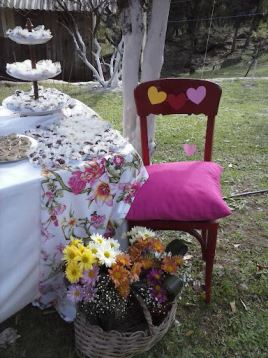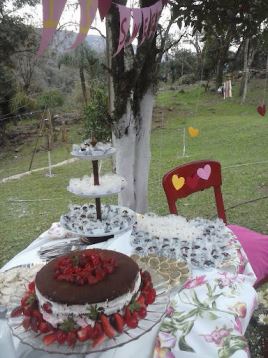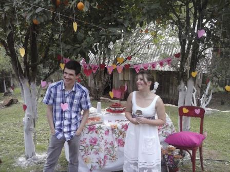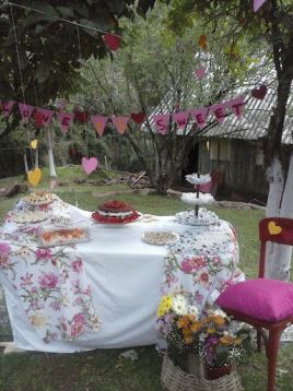 Fiz corações de papel e penduramos em duas laranjeiras, a mesa ficou no centro e eu tenho uma grande toalha branca que foi muito útil.