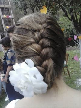 No cabelo fiz uma trança embutida e arrematei com uma flor de tecido 🙂