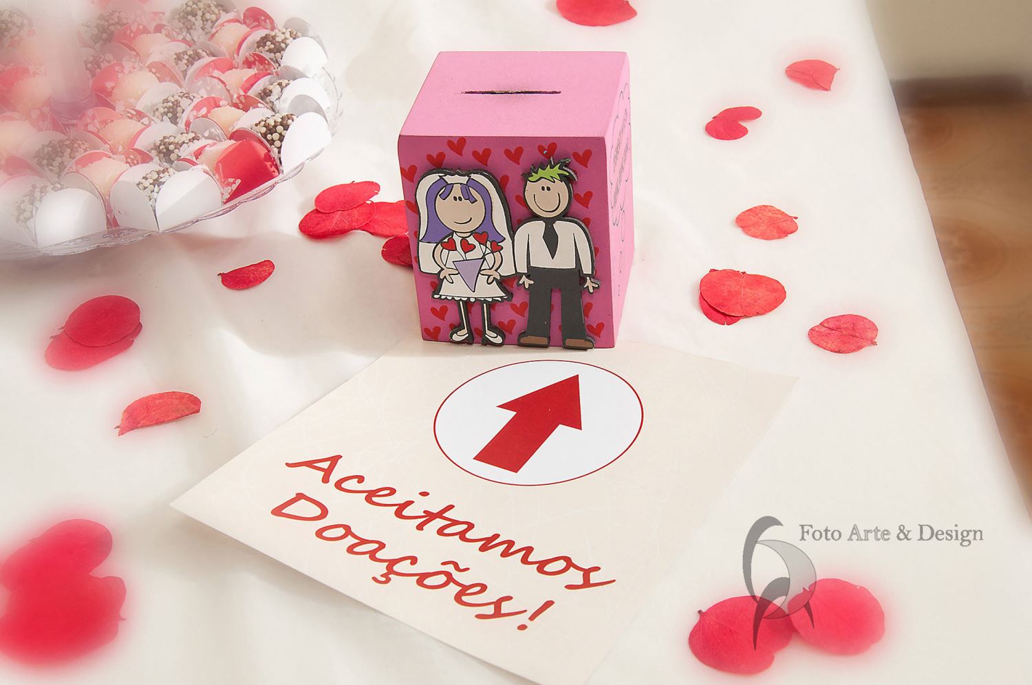 O cofrinho eu comprei na loja Feliz da Vida, no Botafogo Praia Shopping por R$ 45 e coloquei pra decoração já que estávamos trabalhando em cima do conceito “modo econômico”. Acabou que o cofrinho serviu como a gravata do casamento! Rendeu um bom dinheiro! rs… O pessoal se empolgou e contribuiu!
