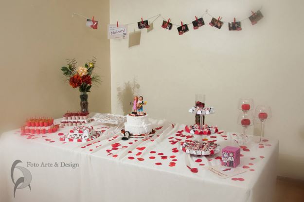 Fizemos cada detalhe do noivado! Eu, meu noivo e a família inteira se mobilizaram. O noivado aconteceu no num sábado, no play do meu prédio (Rio de Janeiro). Para as toalhas das mesas, comprei o tecido no centro da cidade, na Casa Pinto. Não lembro o nome do tecido, que foi R$ 4,00/metro. Tudo deu R$ 120,00. Juntando o tecido + linha e uma vovó costureira, fizemos todas as toalhas! O play, mesas e cadeiras nós já tínhamos. Os potinhos que ficaram em cima da mesa dos convidados também. Compramos apenas velas, folhas secas e anilina pra dar uma cor na água.