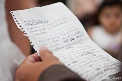 E, mesmo que você tenha tudo na ponta da língua, faça uma colinha básica, ok? Nessas horas não dá para confiar na memória, por mais perfeita que ela seja. Vale imprimir e colocar no casaco do pai, deixar com alguma madrinha, mãe, irmã, enfim, alguém que estará próxima de você, menos o noivo. Ah, gravar no celular soa meio deselegante. Aqui, o mais bonito é o velho e clássico papel.