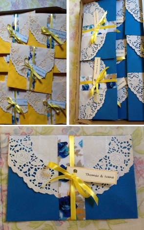 Comecei a planejar nosso casamento com 2 anos de antecedência. Na verdade, contando desde quando ficamos noivos (março/2012) até o casório, vão ser 2 anos e 2 meses que tivemos de planejamento. Esse foi o tempo certo pra colher inspirações e arrumar tudo: juntar as garrafinhas pra decoração e pinta-las; fazer os convites de forma bem artesanal, do jeitinho que queríamos (olha a foto deles aqui embaixo do texto ;)); fazer as lembrancinhas, o buquê de broches e o cabide pra pendurar meu vestido; encomendar o vestido de noiva, a roupa do civil e o vestido de florista da China; comprar o sapato pela internet; procurar itens de decoração vintage, como máquina de escrever, telefone antigo, porta-retratos etc.; fechar o buffet de comida; comprar as bebidas do casamento, as forminhas e os materiais pros doces e pro bolo; dar entrada com os documentos no civil e no religioso; fechar a lua-de-mel; entregar os convites; fazer o teste de cabelo e maquiagem (ficou lindo gente!) e fazer nosso chá-bar. Além de comprar nosso apartamento, dar entrada com mil papéis no banco, esperar a chave ser entregue e, depois, contratar pintor, pedreiro, vidraceiro, marceneiro, eletricista… E ir atrás dos móveis do quarto, sala, cozinha…