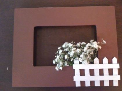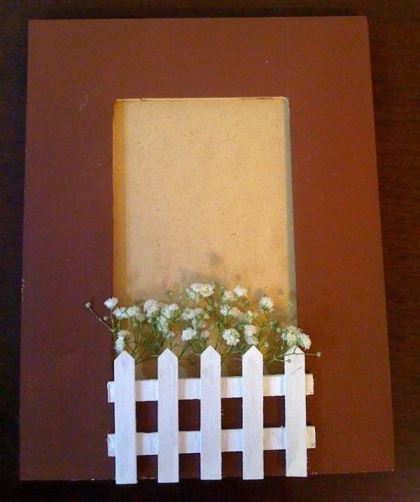 – Compre enfeitinhos pra deixar seu trabalho mais caprichado. Eu comprei mini vasinhos, mini banquinho de praça, mini cerquinhas. Tudo a preços de centavos. Pintei as cerquinhas e o banquinho com tinta branca, umas duas mãos, até sumir o MDF. E pra deixar tudo com ar ainda mais bucólico, usei gipsophylas pra dar um charme. Colei as peças com cola branca e as florzinhas com cola quente, porque eu queria que elas secassem até meu casamento, pra ficar ainda mais campestre.