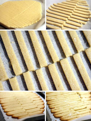 de confeitar com a ponta chata fazer palitinhos como na foto acima e assar. Ah use uma folha de papel manteiga na forma para deixa-los corados como batatinhas e impedir que queimem.