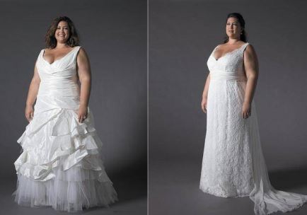 Para a barriga saliente: a noiva deve jogar a atenção para os ombros. Um vestido com os ombros aparecendo tira a atenção da barriga e sobe para o ombro ou colo. O modelo império valoriza o colo e esconde a barriga. Outra opção é usar um drapeado abaixo do busto disfarça estômago saliente e ajuda a sustentar os seios.